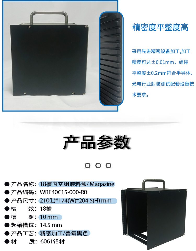 產(chǎn)品簡(jiǎn)介: 產(chǎn)品編號(hào):WBF40C15-000-R0;ASM18槽組裝式料盒采用6061鋁板經(jīng)過cnc精密加工、打磨、表面氧化處理、組裝校驗(yàn)、包裝等工序精制而成,產(chǎn)品整體精密度平整度高,穩(wěn)固耐用符合行業(yè)ASM設(shè)備等技術(shù)要求,旋轉(zhuǎn)檔桿+可開關(guān)背板設(shè)計(jì)存取物料更加方便快捷,表面經(jīng)過噴砂氧化后槽內(nèi)和表面光滑無毛刺周轉(zhuǎn)存放物料更安全。如需了解更多產(chǎn)品更多資料馬上撥打400 037 3188進(jìn)行咨詢吧!